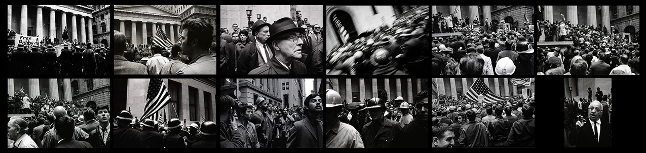 In the photographs students are shown first occupying Federal Hall steps, then people watching and listening often to the many spontaneous discussions which sprang up amidst the crowd, construction workers charge the steps and push out the anti-war demonstrators, watching and talking resumes.
